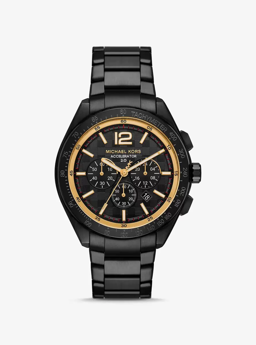 Meet the Accelerator 2.0. Made from black-tone stainless steel, this oversized style encourages you to go for bold. A contrast bezel frames the sporty face, which features sleek hour markers, a date dial and chronograph details.