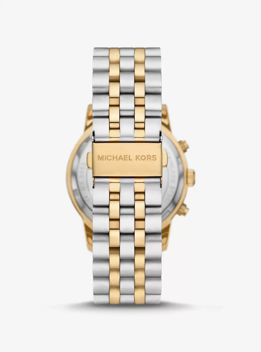 Designed for those who appreciate the luxury of time, our Hutton is the statement watch to own. A chronograph display delivers precision timekeeping, while two-tone stainless steel craftsmanship ensures it will stand up to endless wear. A textured topring and “MK” print dial lends a subtle yet sophisticated finish.