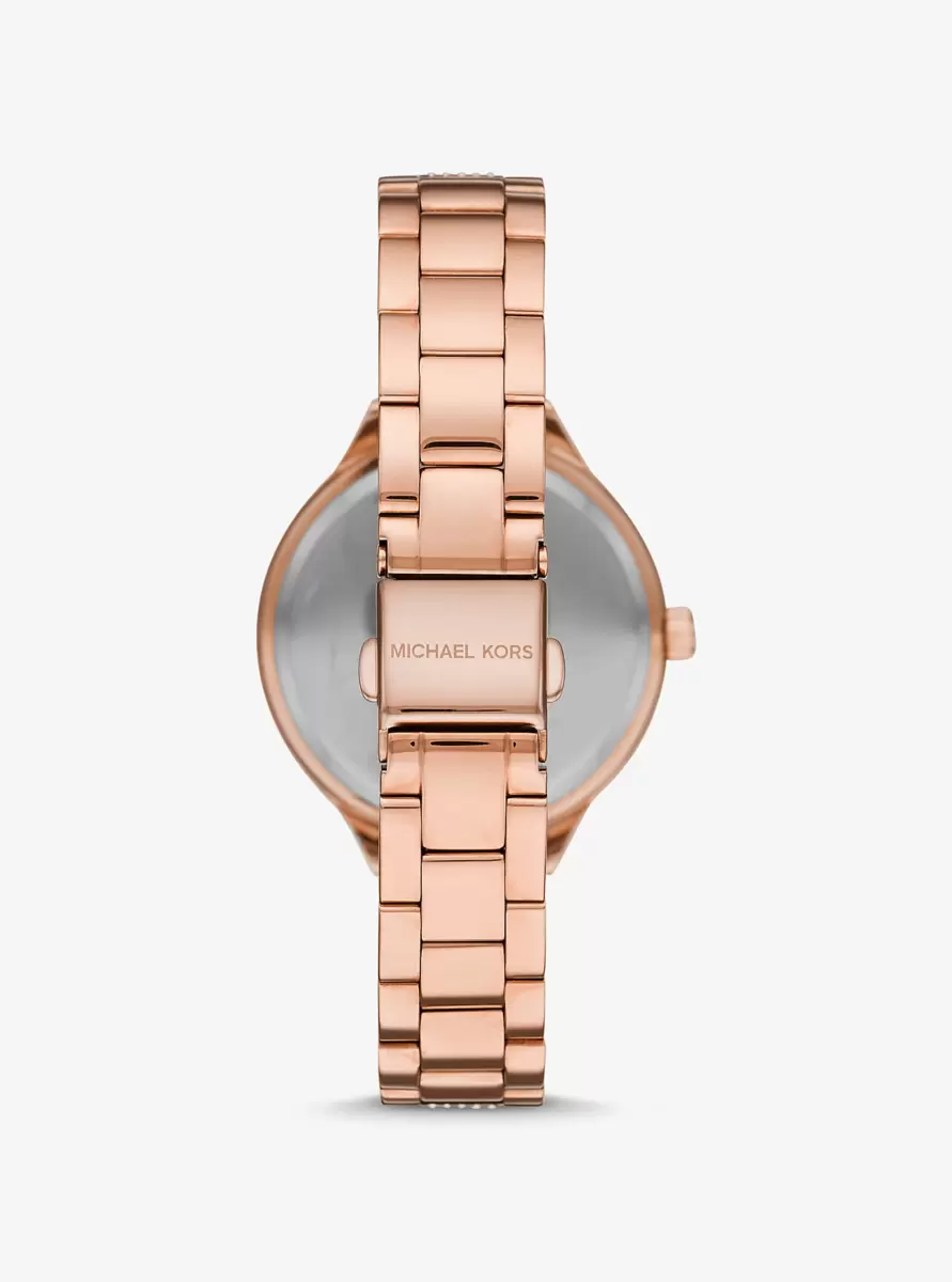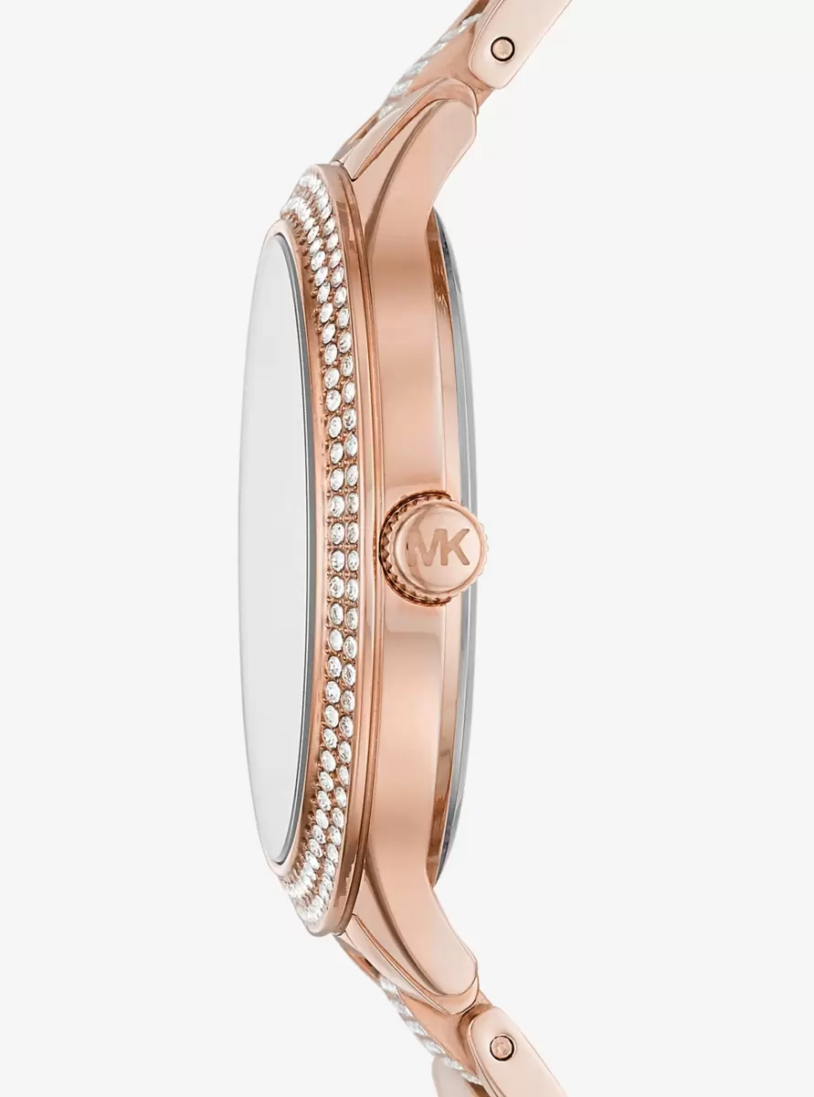A perennial favorite, our iconic Slim Runway watch gets a sparkling update with a pavé-accented dial, bezel and center links. This statement style is crafted from rose gold-tone stainless steel and features minimalist time stops.