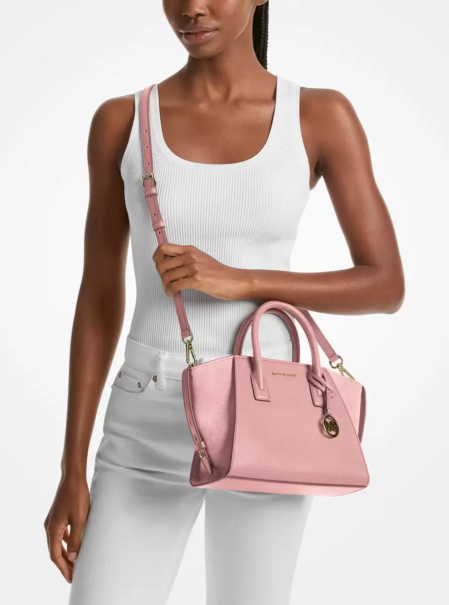 Equally versatile and sophisticated, our Avril satchel is a must-have addition to your handbag lineup. Crafted from pebbled leather with suede panels, this design is rendered in a standout silhouette that features a detachable crossbody strap and opens to a pocketed interior. It’s the perfect complement to office-ready looks and casual weekend wear alike.