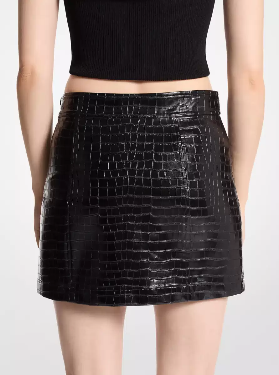 A crocodile-embossed texture gives this mini skirt a maximal punch. Create a tough-luxe look with a simple tank and chunky loafers, or dress it up with a crisp button-up and heels.