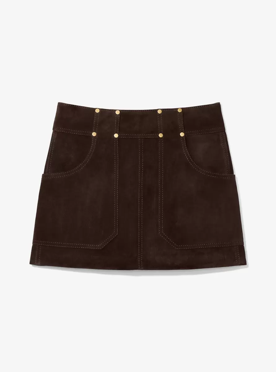 Crafted from luxurious suede, this head-turning mini skirt features gold-tone stud detailing along the waistband and functional front pockets for both style and practicality. Complete the look with the matching fringed jacket for a coordinated Western-inspired ensemble.