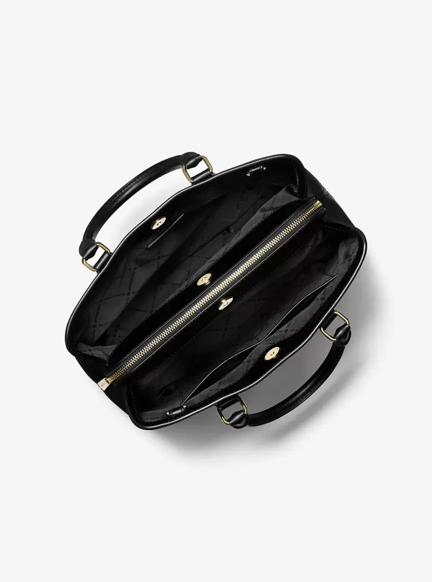 The key to refinement. Designed with a smooth finish, the Camille satchel combines a smart, streamlined silhouette with a polished lock and key for the epitome of sophisticated glamour. Carry it by the top handles or sling the adjustable crossbody strap over your shoulder for modern appeal. Team it with your favorite white tee and denim to elevate off-duty classics.