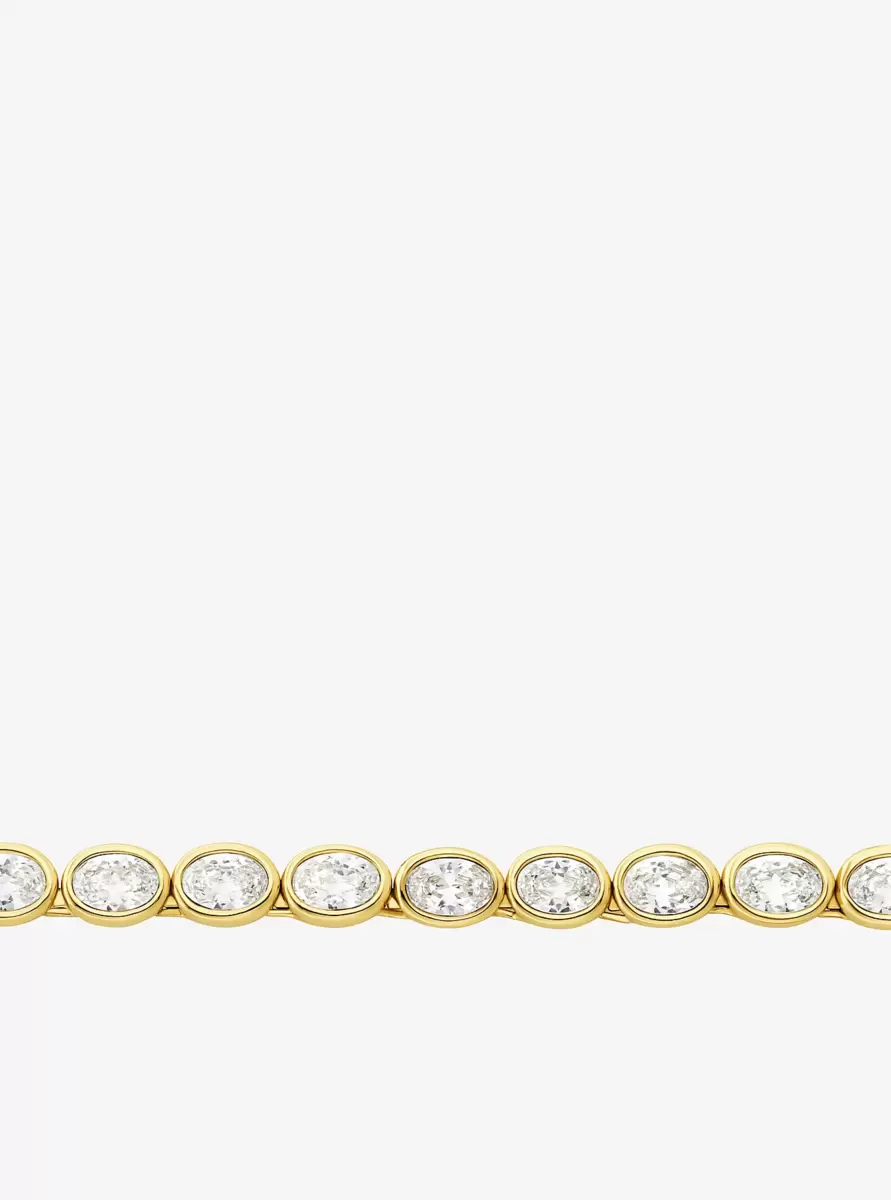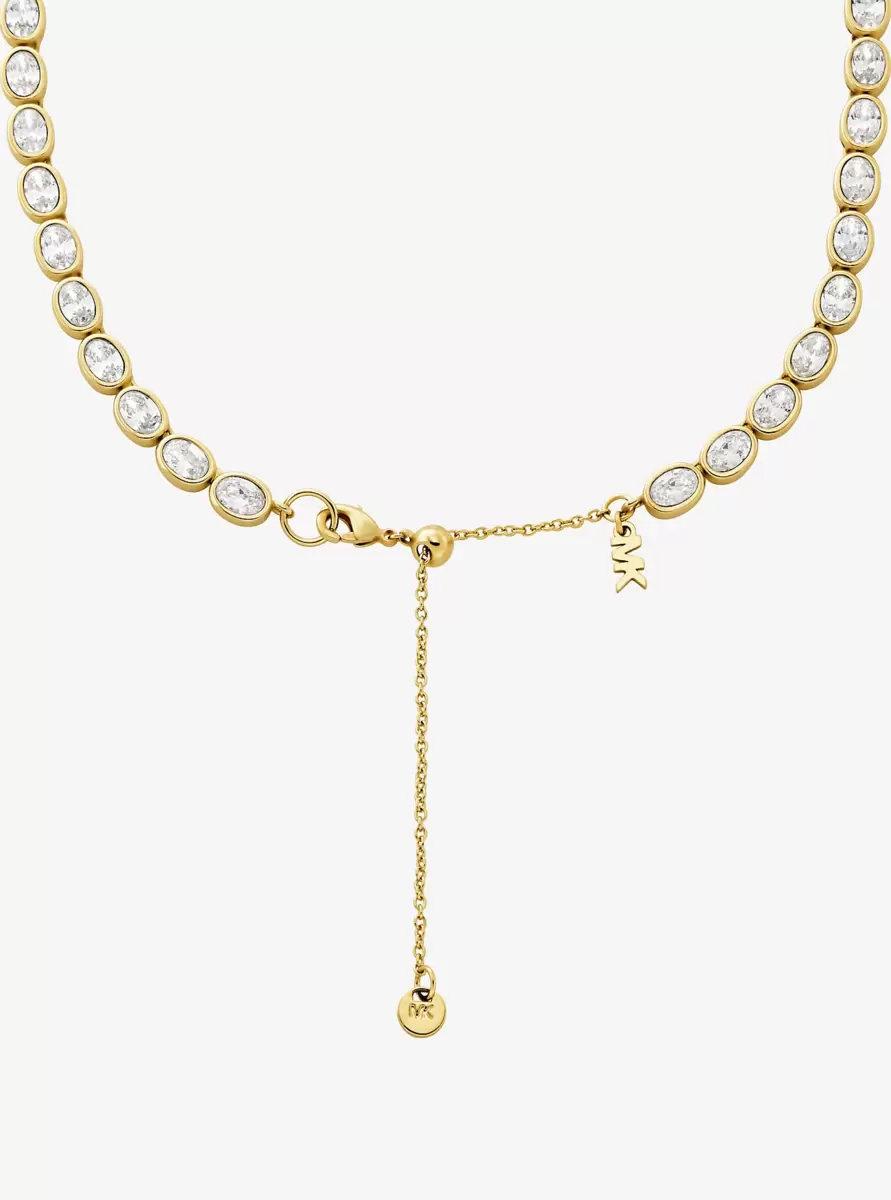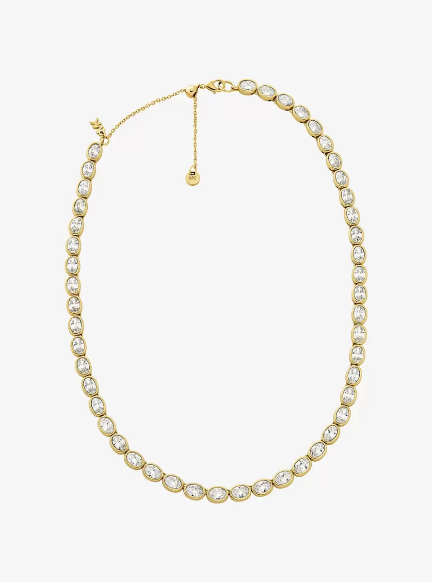 This dazzling tennis necklace features a full string of brilliant stones encased in 14K-gold-plated brass for added lustre. Wear it on its own or paired with the matching bracelet for a true statement look.