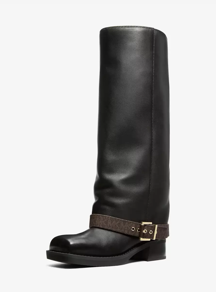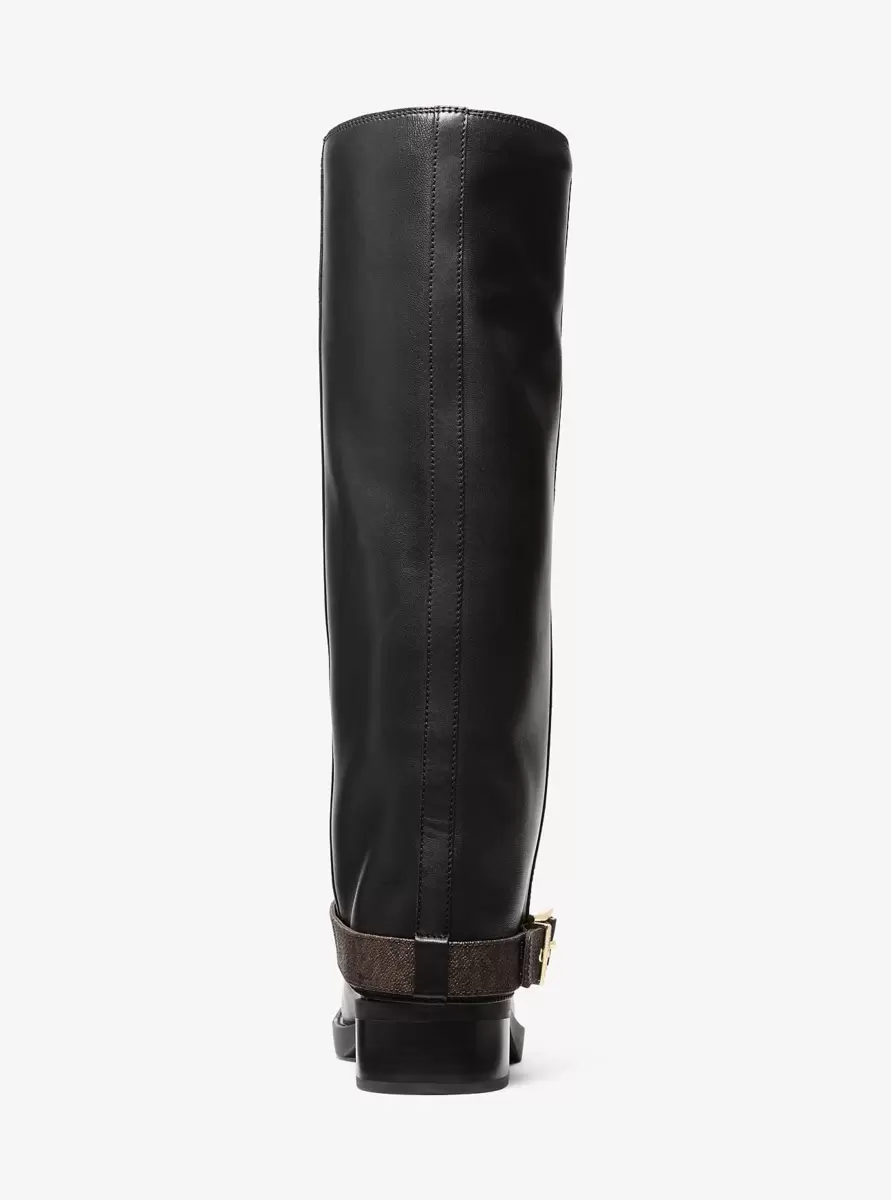 Taking inspiration from the details of a moto boot and the streamlined silhouette of a riding boot, the Colby is surprisingly versatile. Crafted from smooth leather with a Signature logo print strap at the vamp, this knee-high style teams well with everything from dresses to shorts.