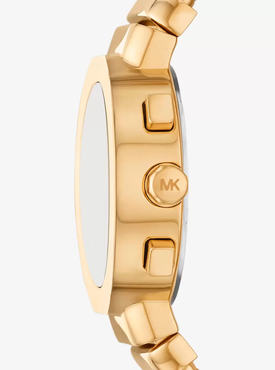 An instant classic: our utility-inspired Gramercy watch.Designed in gold-tone stainless steel, this elegant style features chronographdials and an interlocking strap for textural contrast.