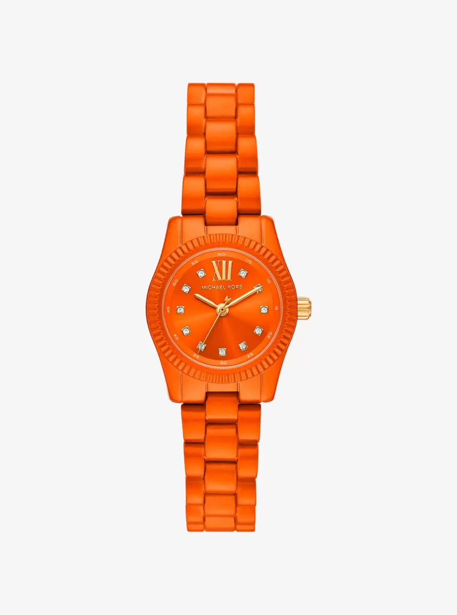 Reimagined with sparkling pavé and gold-tone accents for a touch of shine, our petite Lexington watch exudes everyday glamour for Spring 2025. Dipped in an eye-catching orange hue for a daring twist, this limited-edition version is made with a stainless steel casebody that turns to reveal Michael Kors’ engraved signature on the back and a unique identification number. Complete with a beveled topring and matching bracelet strap, this dainty timepiece will give both day and night outfits a dose of sophisticated charm.
