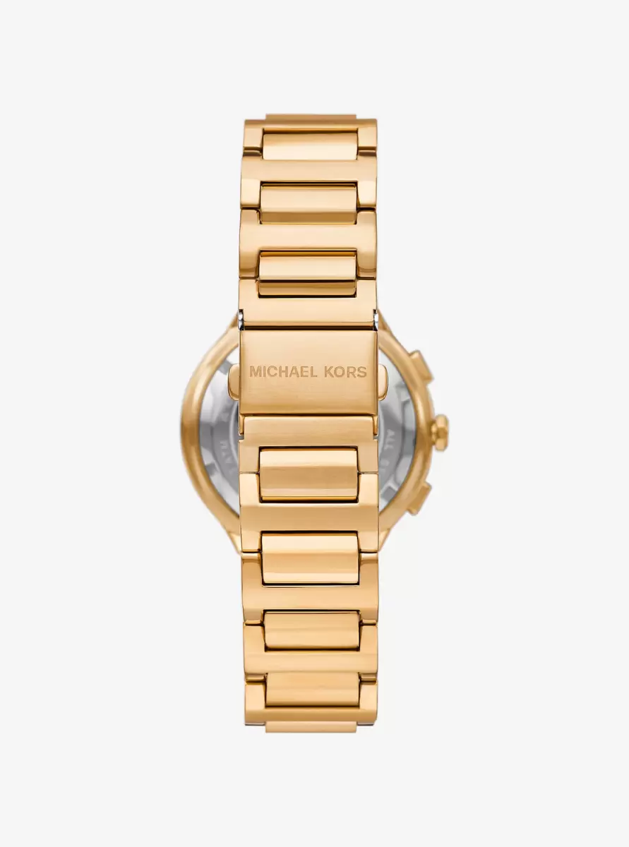 An instant classic: our Gramercy watch. Designed in gold-tone stainless steel, this menswear-inspired style features chronograph dials and a bracelet link strap for ultimate functionality.
